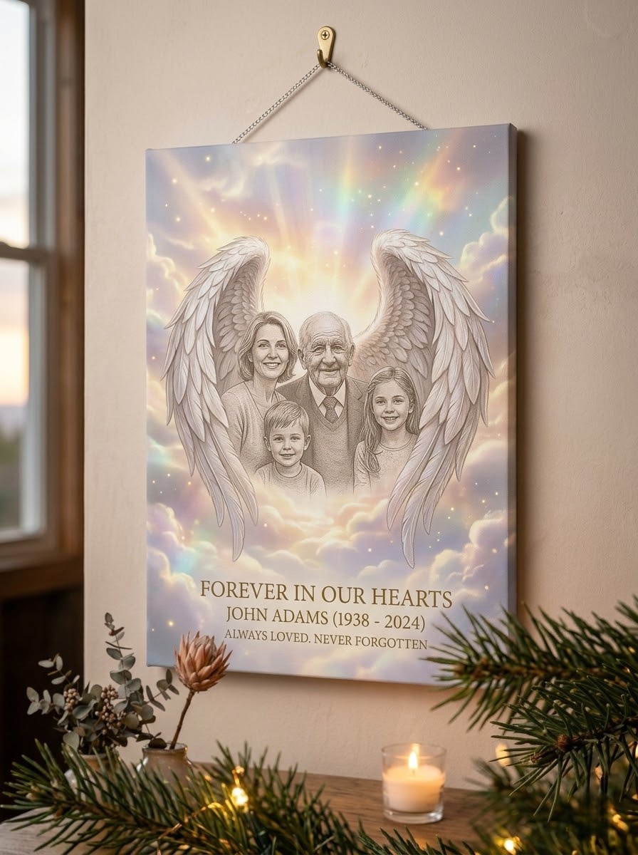 Heavenly Photo Wall Art – Personalized Memorial Canvas with Angel Wings Forever in Our Hearts